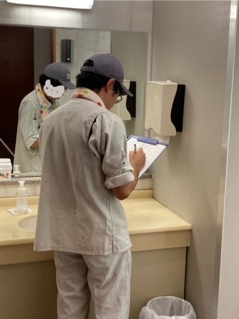 トイレ清掃は、現場他のメンバーが男子トイレの清掃を行っているので、奥から多目的、女子トイレと進んでいきます。