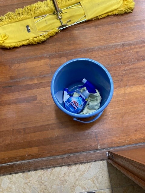 女子トイレ横の用具入れから必要な清掃道具を取り出して、清掃場所へむかいます。