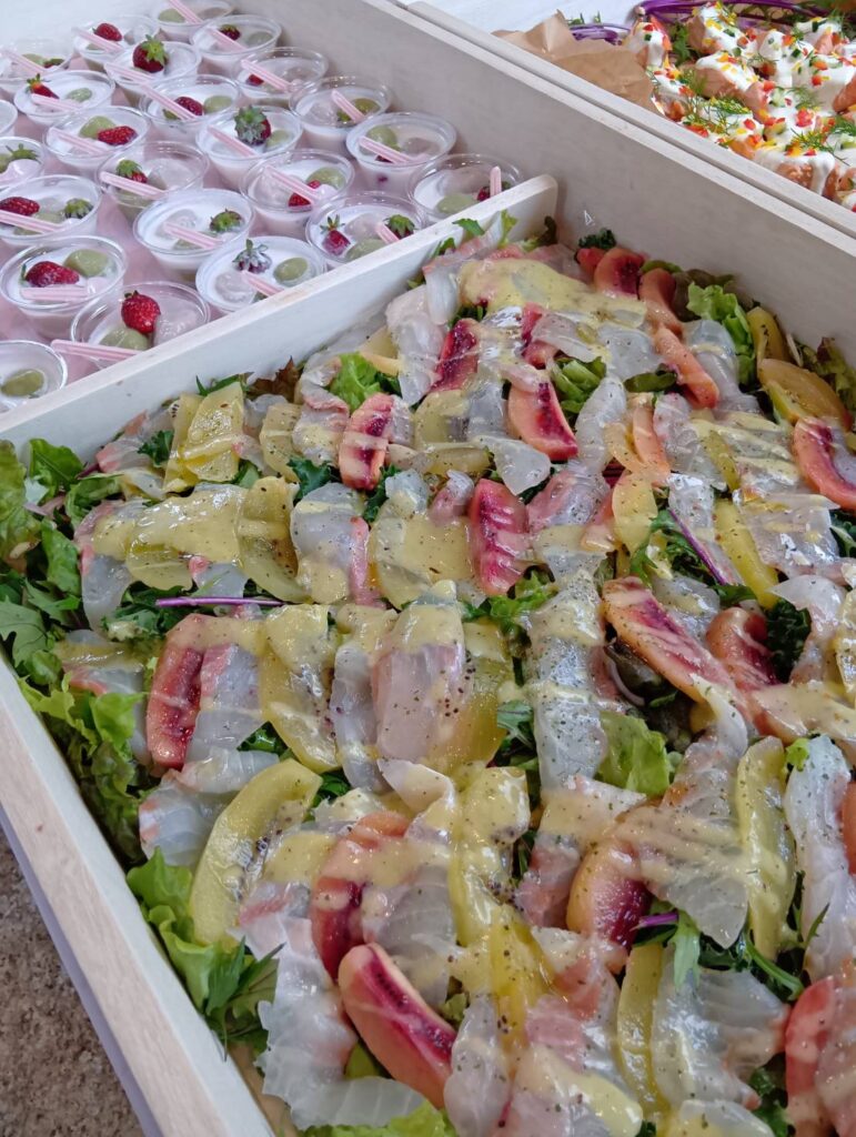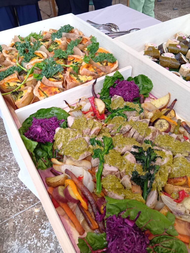 葉桜一歩手前。強風で折れた桜を会場にあしらって、春の香りと弦楽器の音色、そして岡まゆみさんの地産地消の野菜を中心にした「おもてなし8種」に、参加者からは「心身大満足のひととき」「ぜひ、また再演を」との声が。